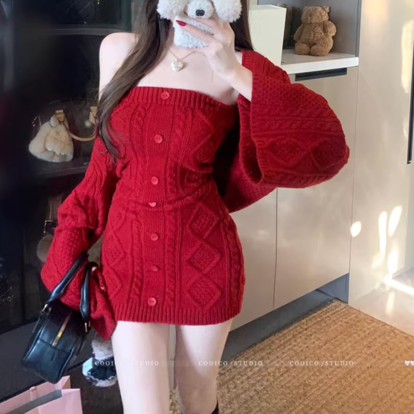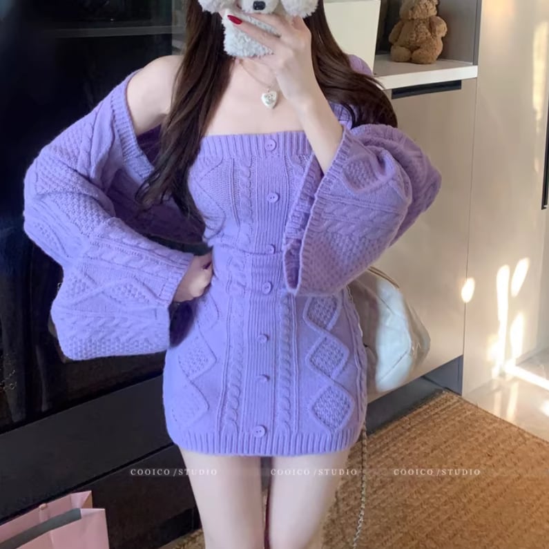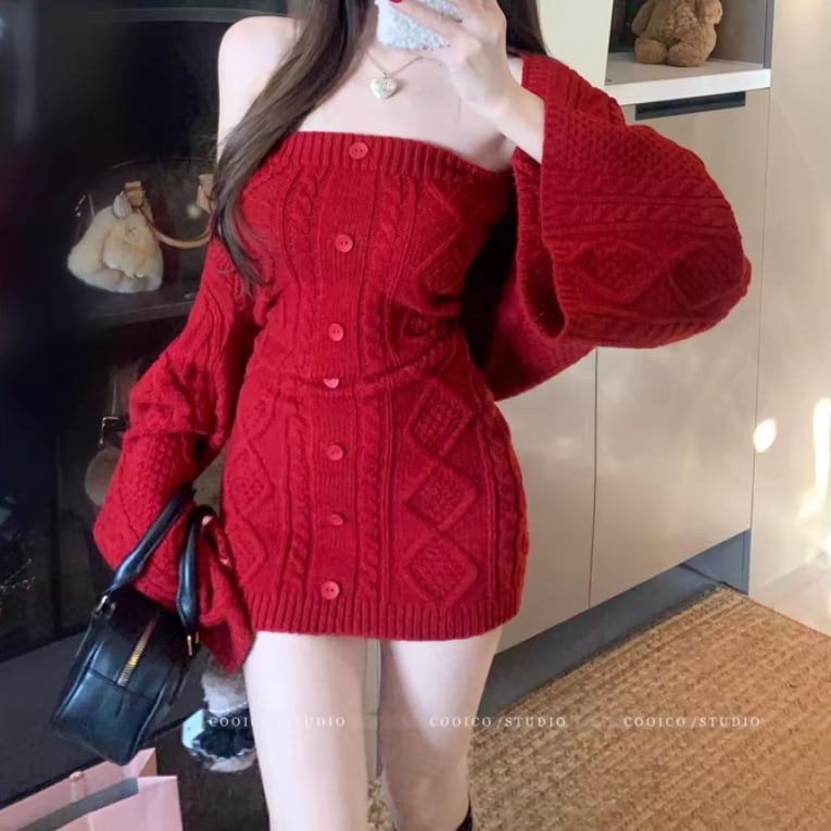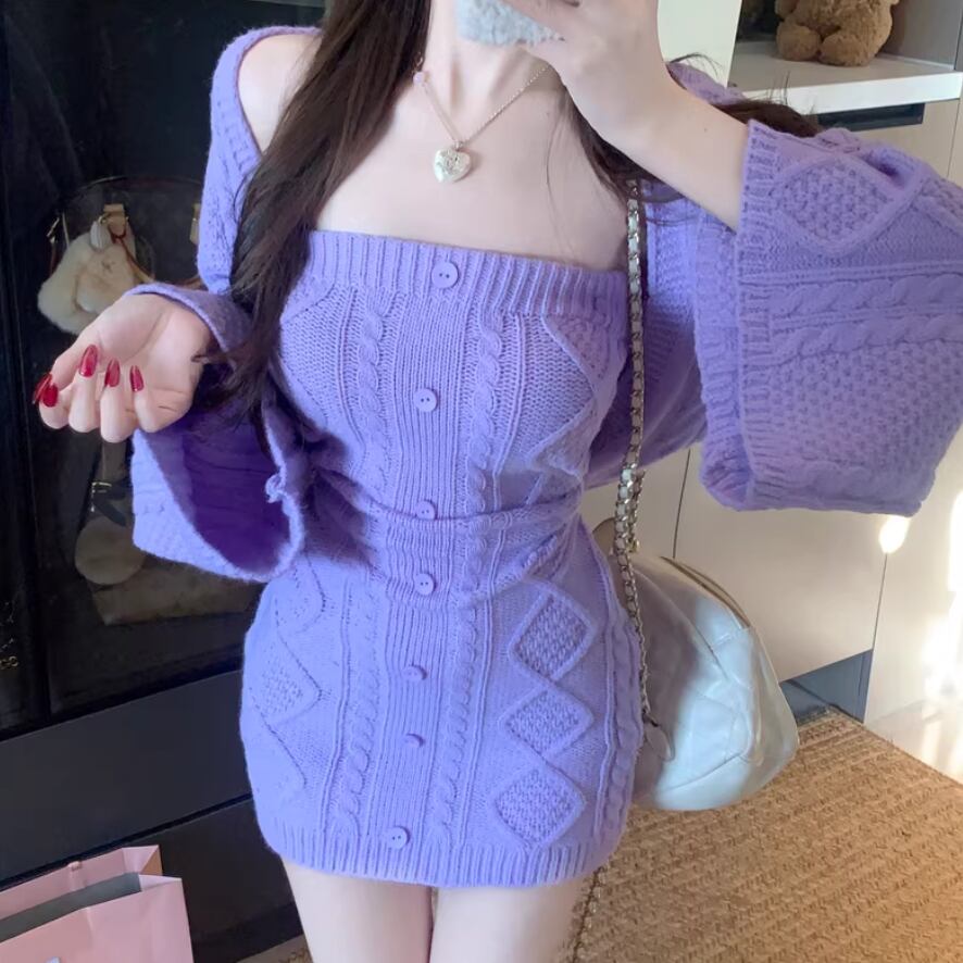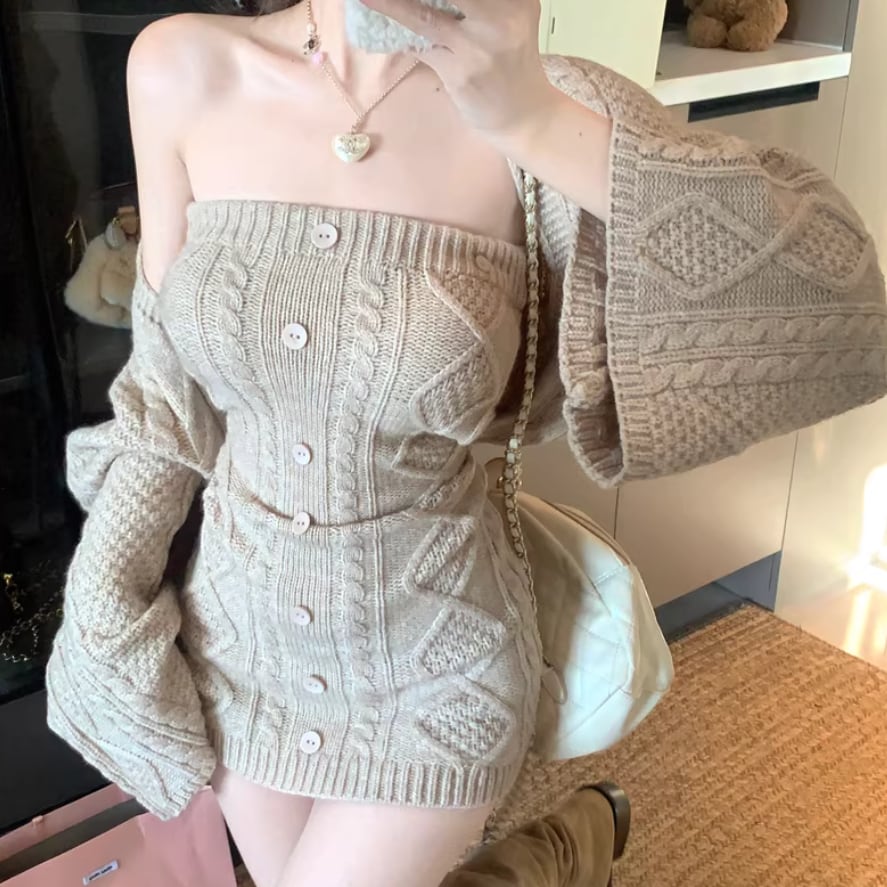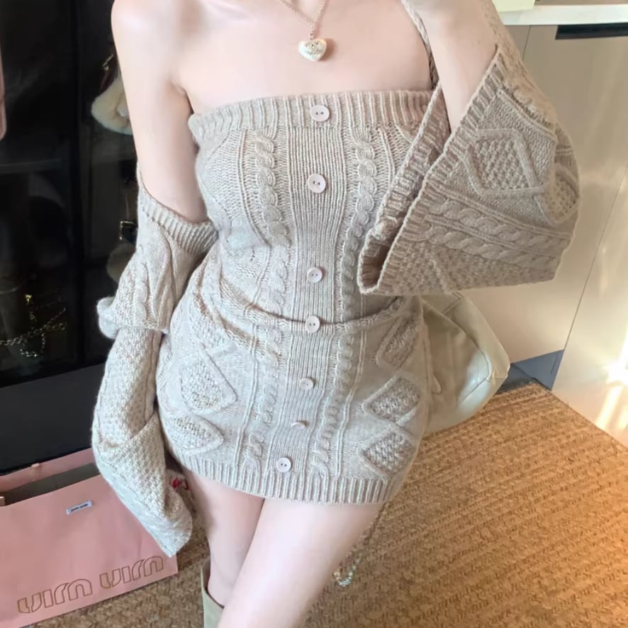 【2点セット】3色/パールデコフリルオフショルセーター+ニットミニスカート ・73703