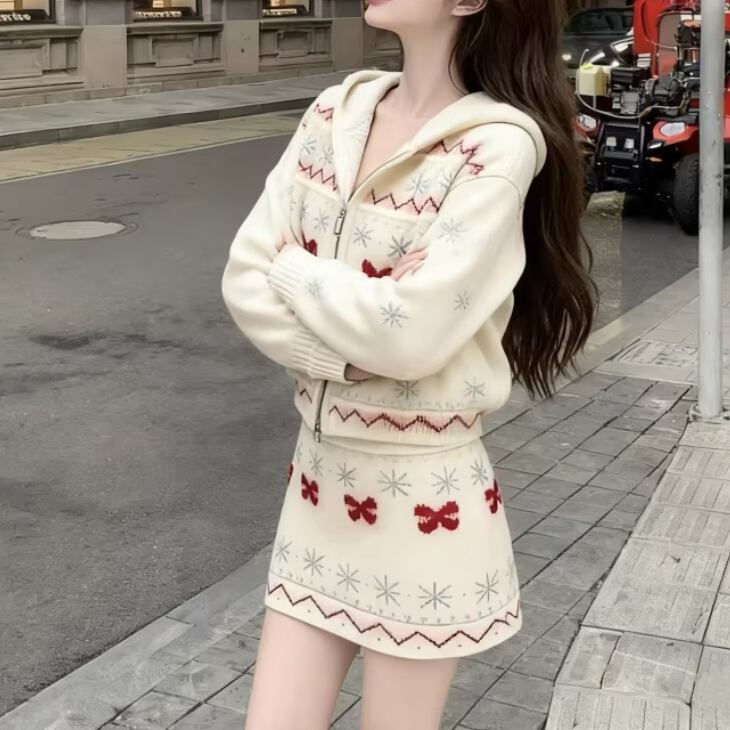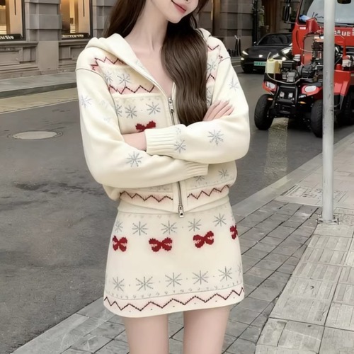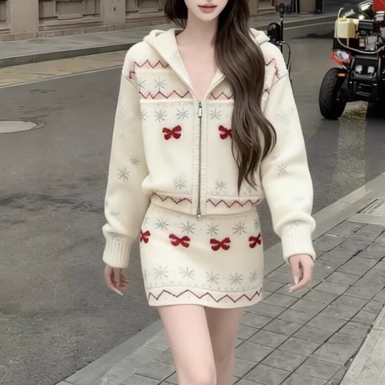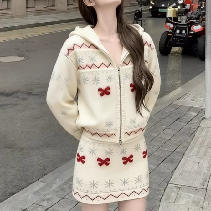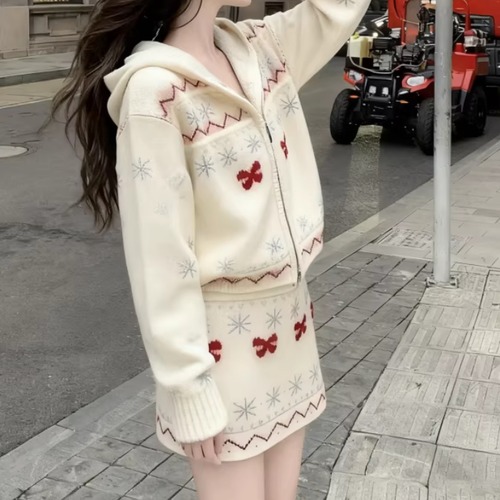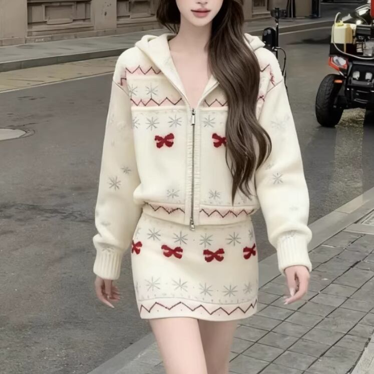 【2点セット】3色/パールデコフリルオフショルセーター+ニットミニスカート ・73703