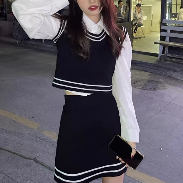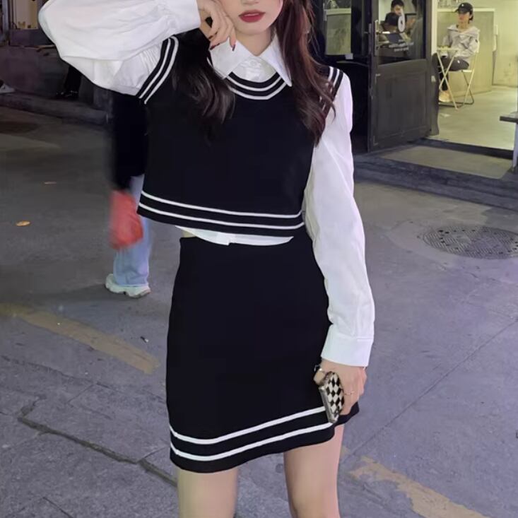 【2点セット】ストライプフライングスリーブシャツ+ハイウエストバルーンミニスカ ・69972