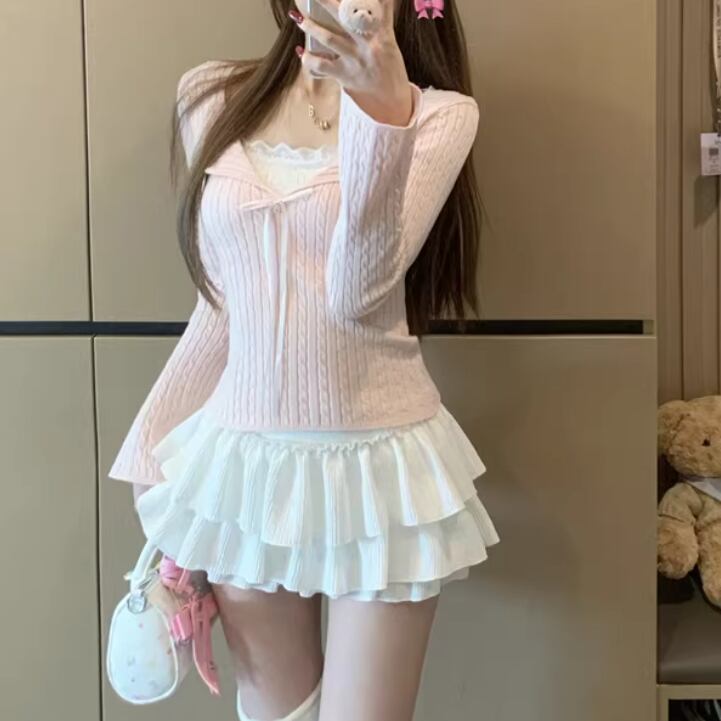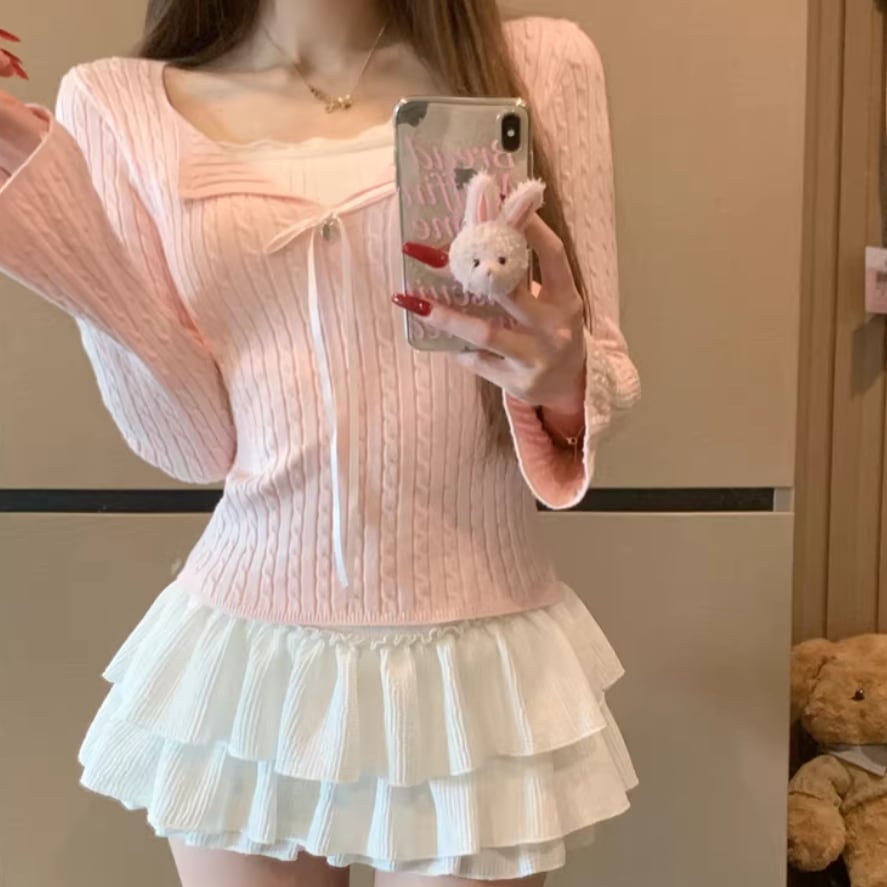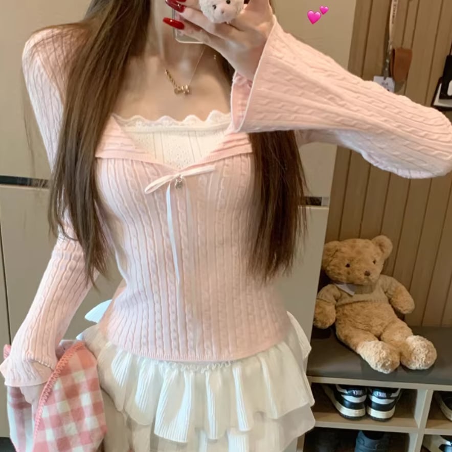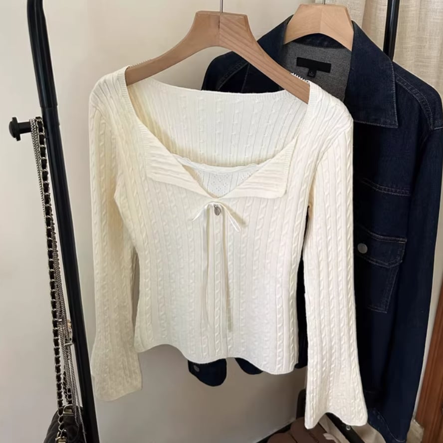 2色/スカラップネックリボンニットトップス ・75360