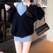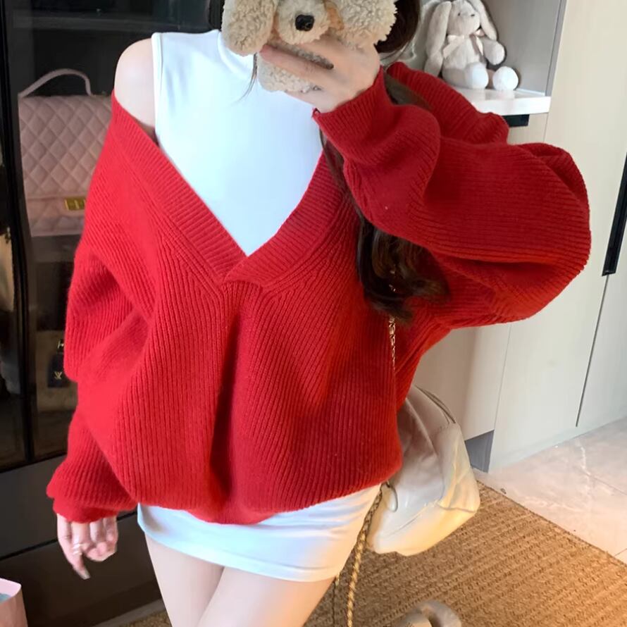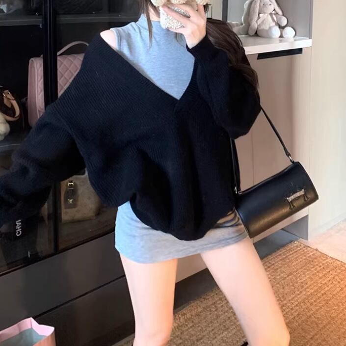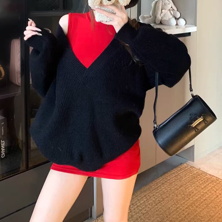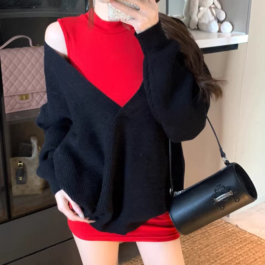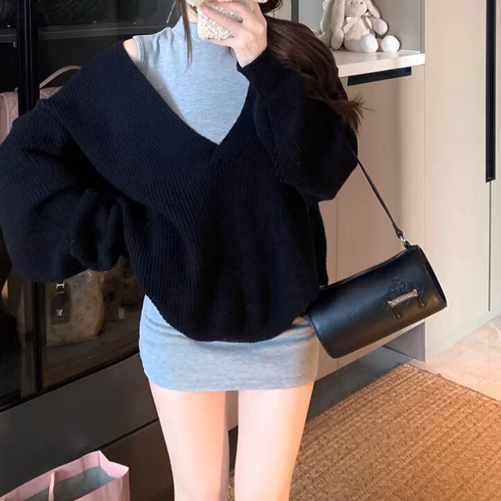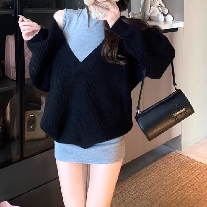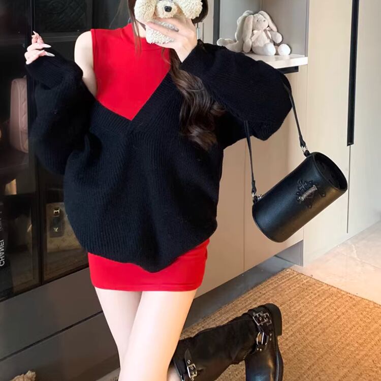 【2点セット】3色/パールデコフリルオフショルセーター+ニットミニスカート ・73703