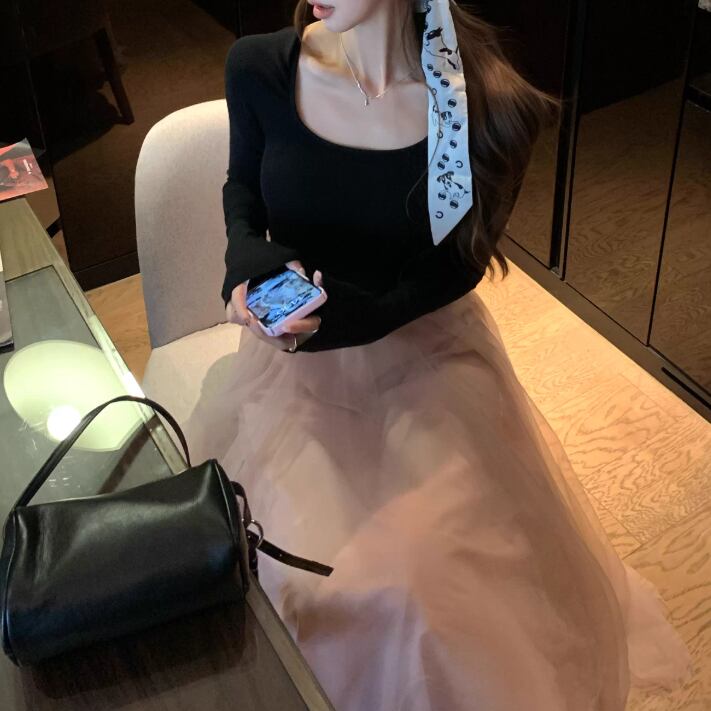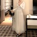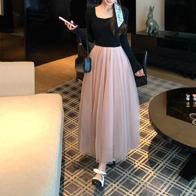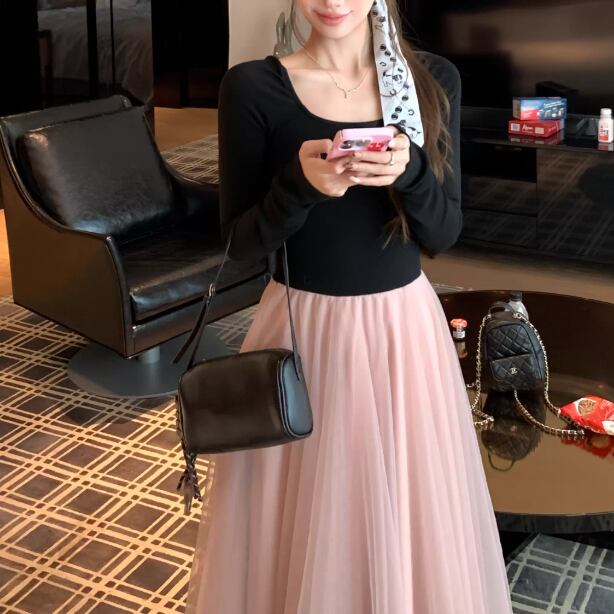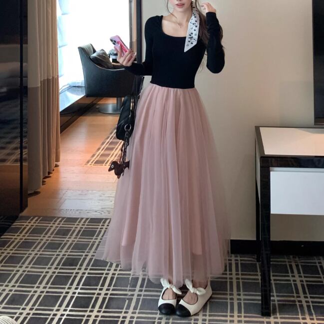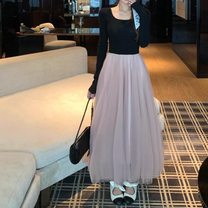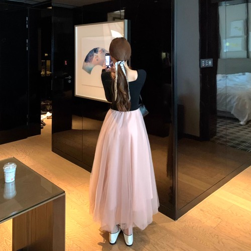 2色/チュールフラワーフリルネックボウタイワンピ ・54889