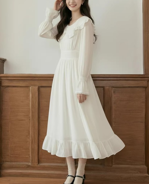 2色/チュールフラワーフリルネックボウタイワンピ ・54889