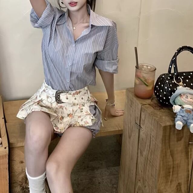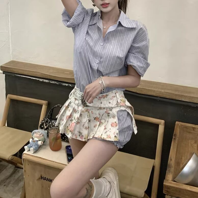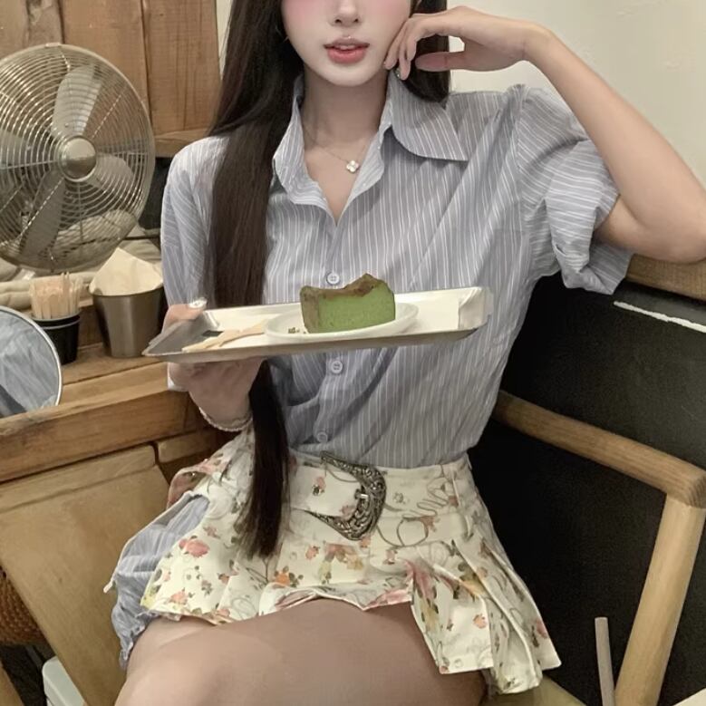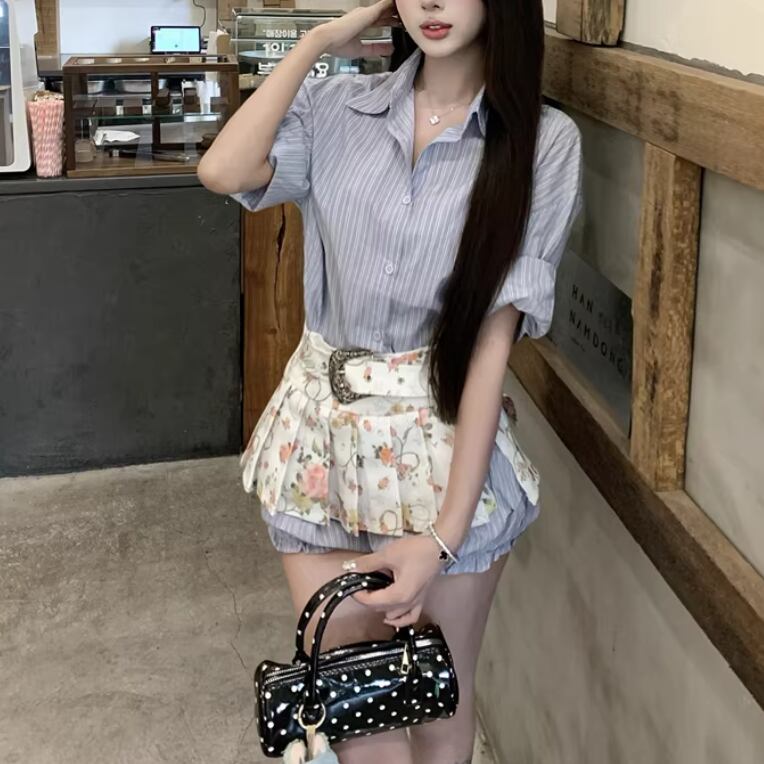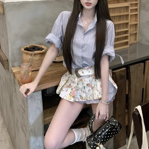 【2点セット】ストライプフライングスリーブシャツ+ハイウエストバルーンミニスカ ・69972