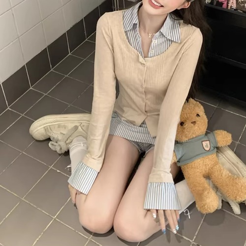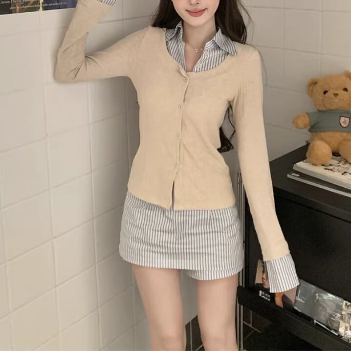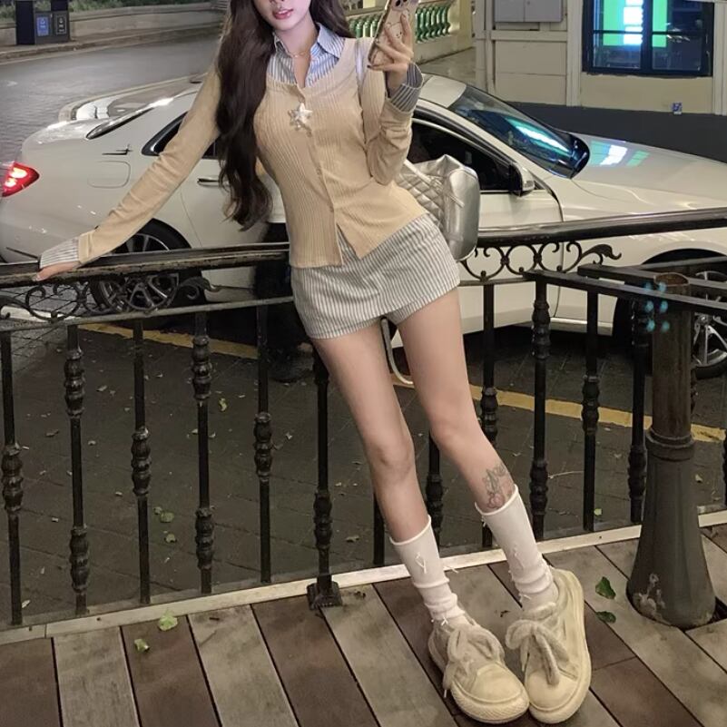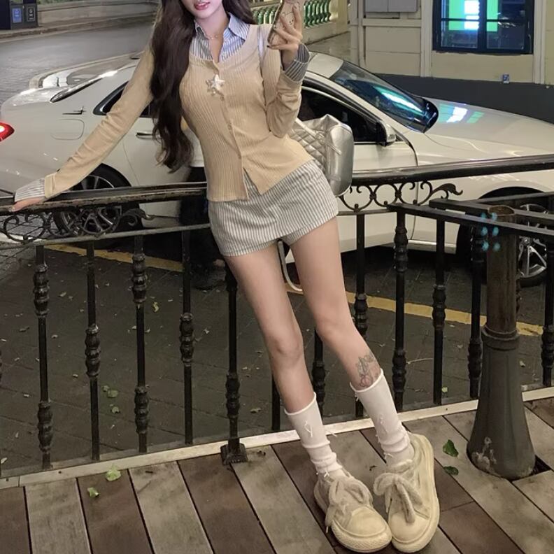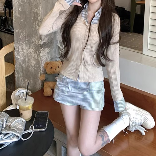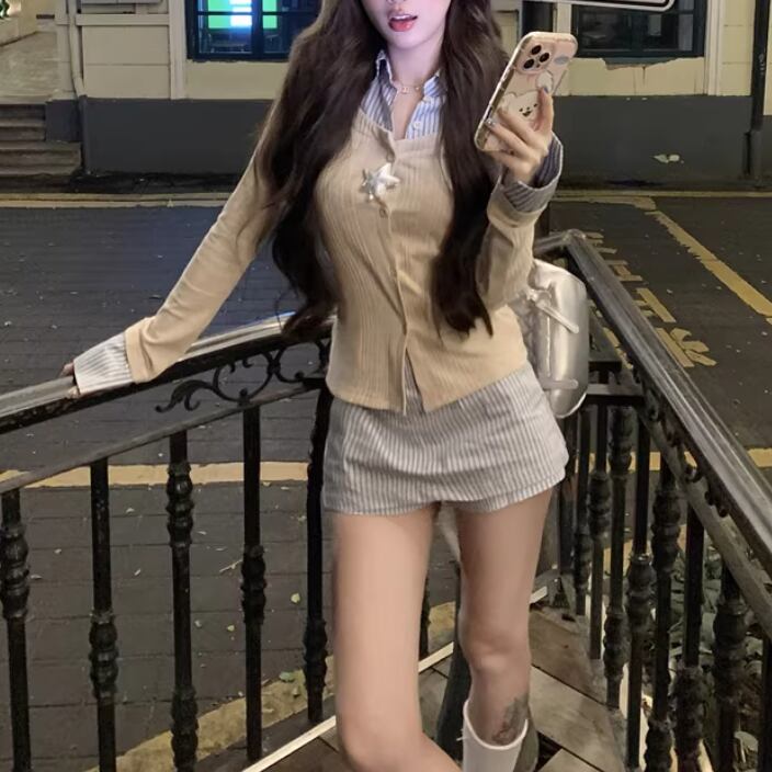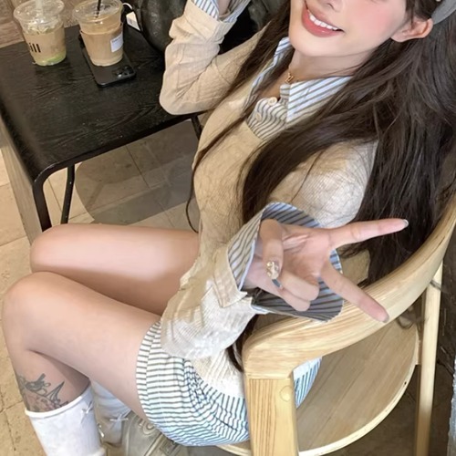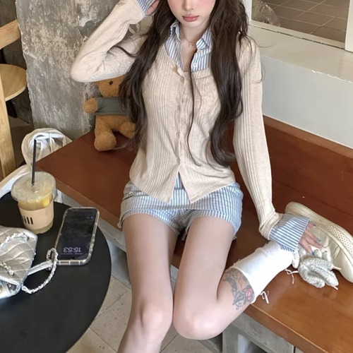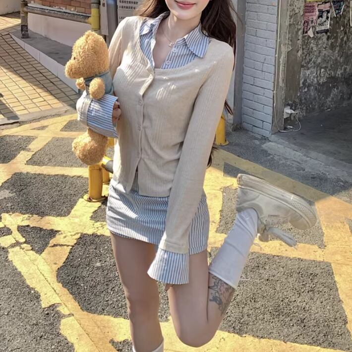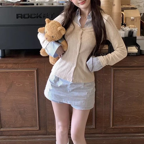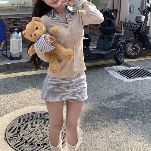 【2点セット】ストライプフライングスリーブシャツ+ハイウエストバルーンミニスカ ・69972