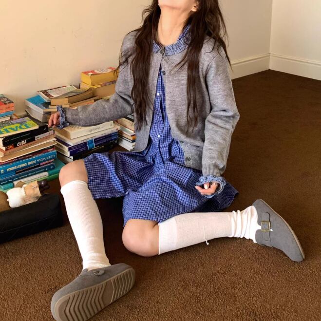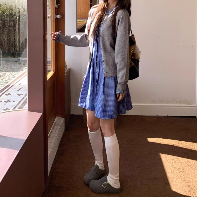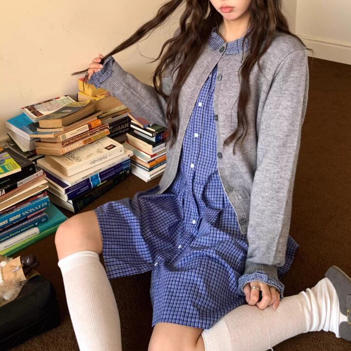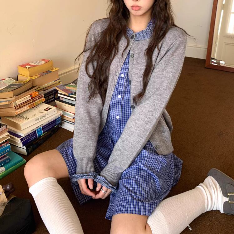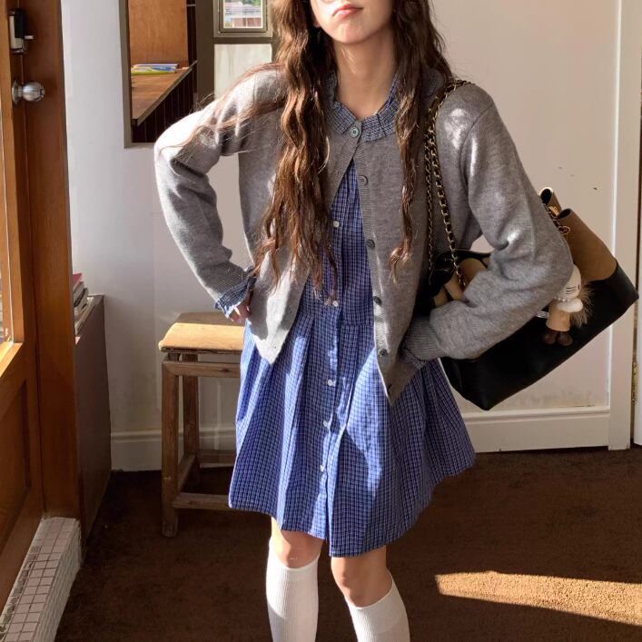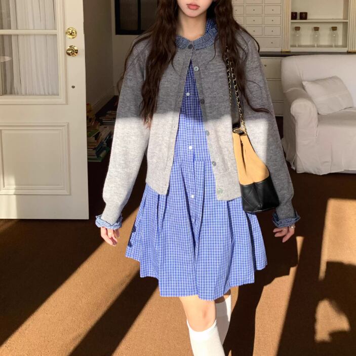 【2点セット】ポイントチェッククルーネックニットカーデ+チェックプリーツスカート ・74241