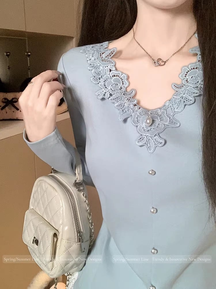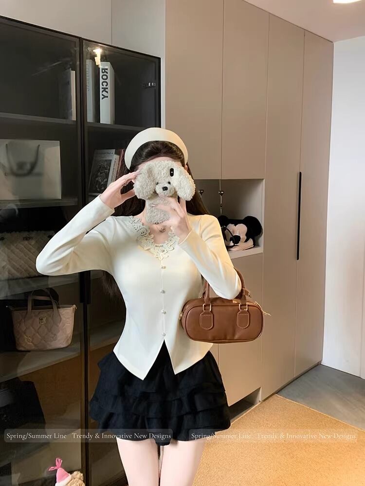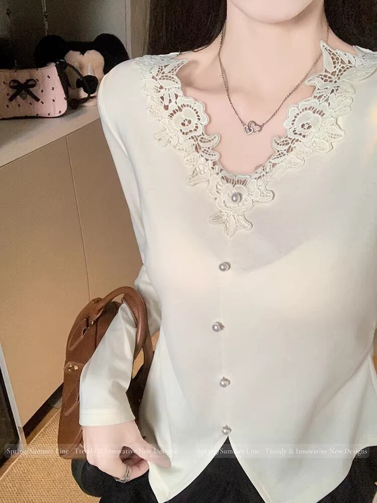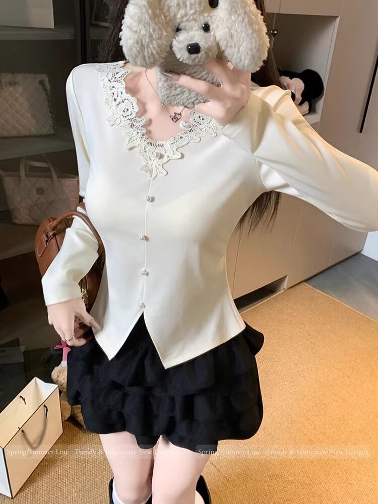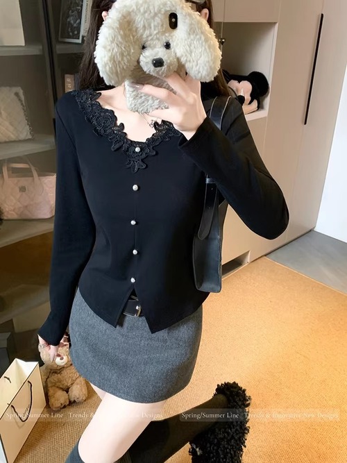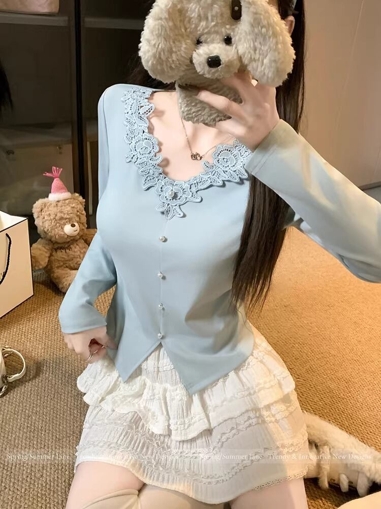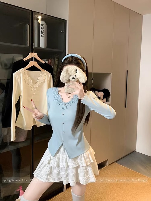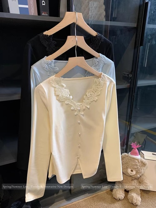 レースカラーアシメボタンドッキングトップス ・71106