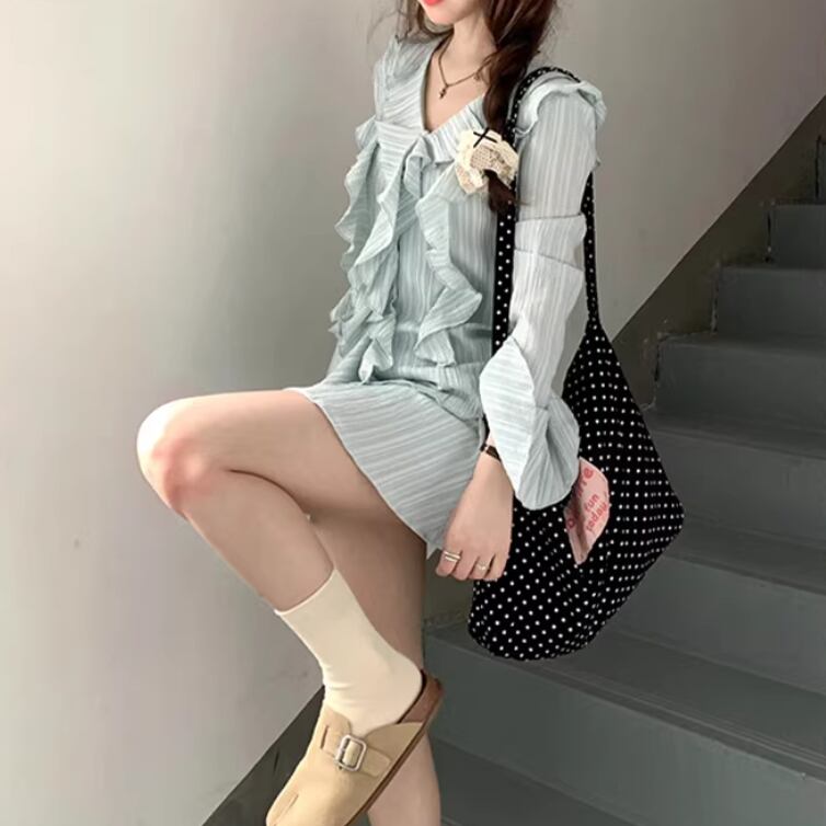 【2点セット】ストライプフライングスリーブシャツ+ハイウエストバルーンミニスカ ・69972