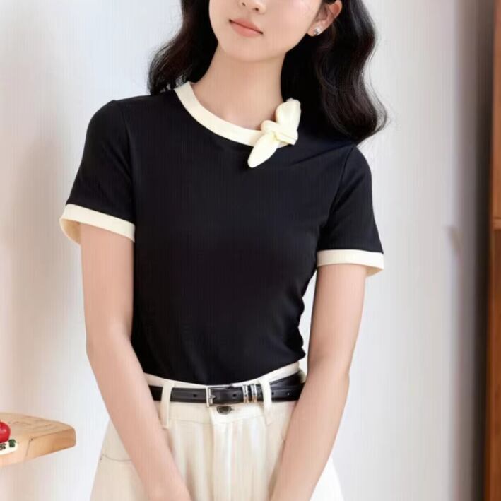 3色/リボンポロカラーリブニットトップス ・75455
