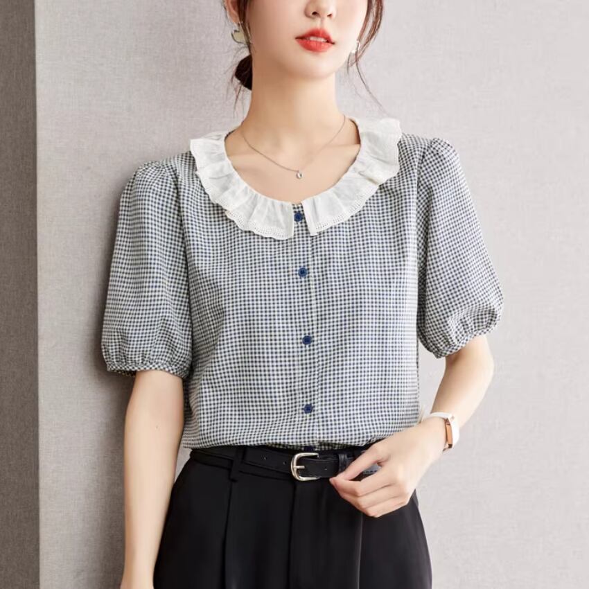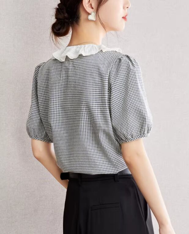 チェックスカラップレースヘムブラウス ・76379