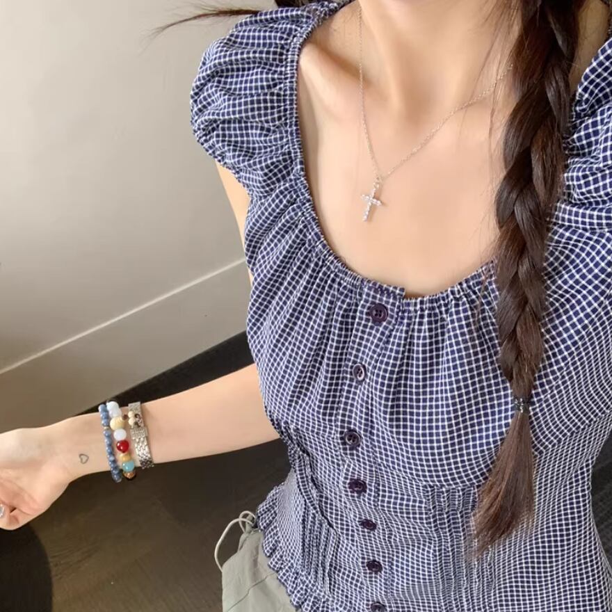 チェックスカラップレースヘムブラウス ・76379