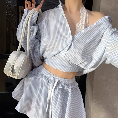 【2点セット】ストライプフライングスリーブシャツ+ハイウエストバルーンミニスカ ・69972