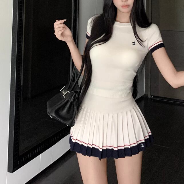 【2点セット】ストライプフライングスリーブシャツ+ハイウエストバルーンミニスカ ・69972