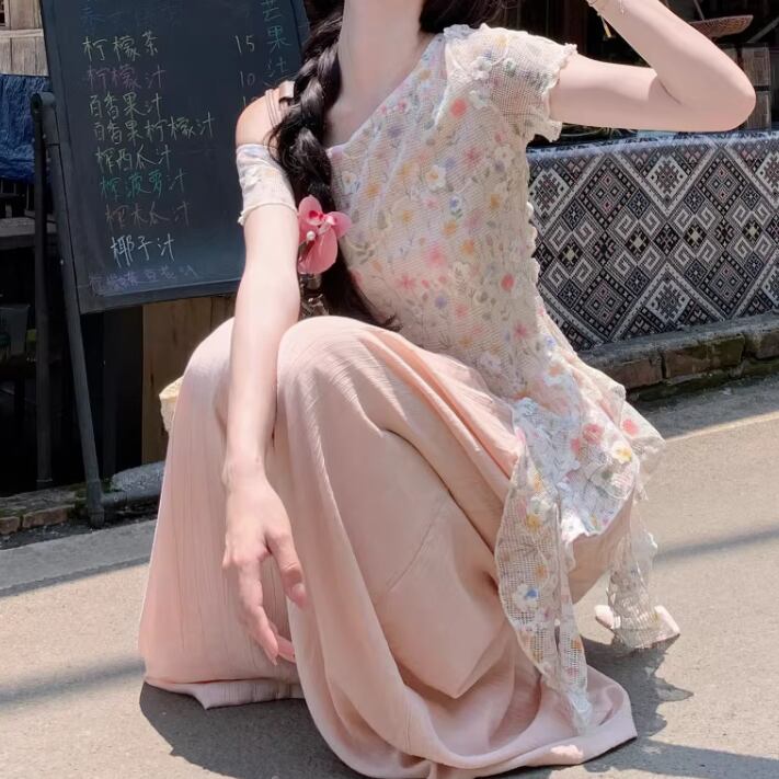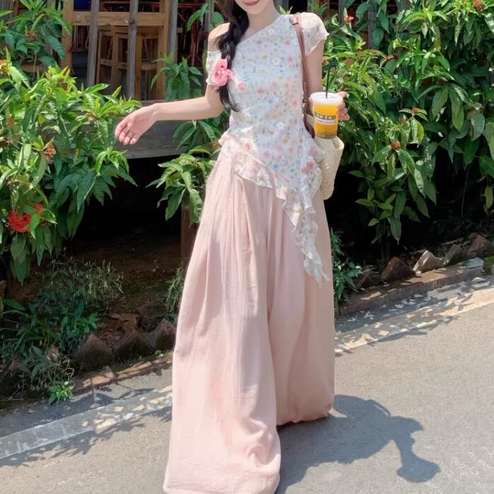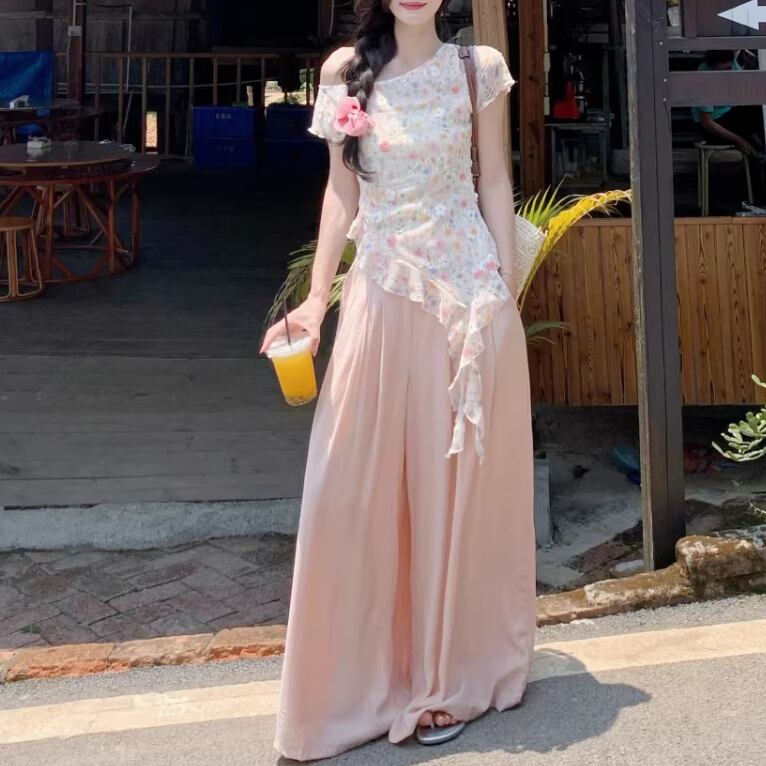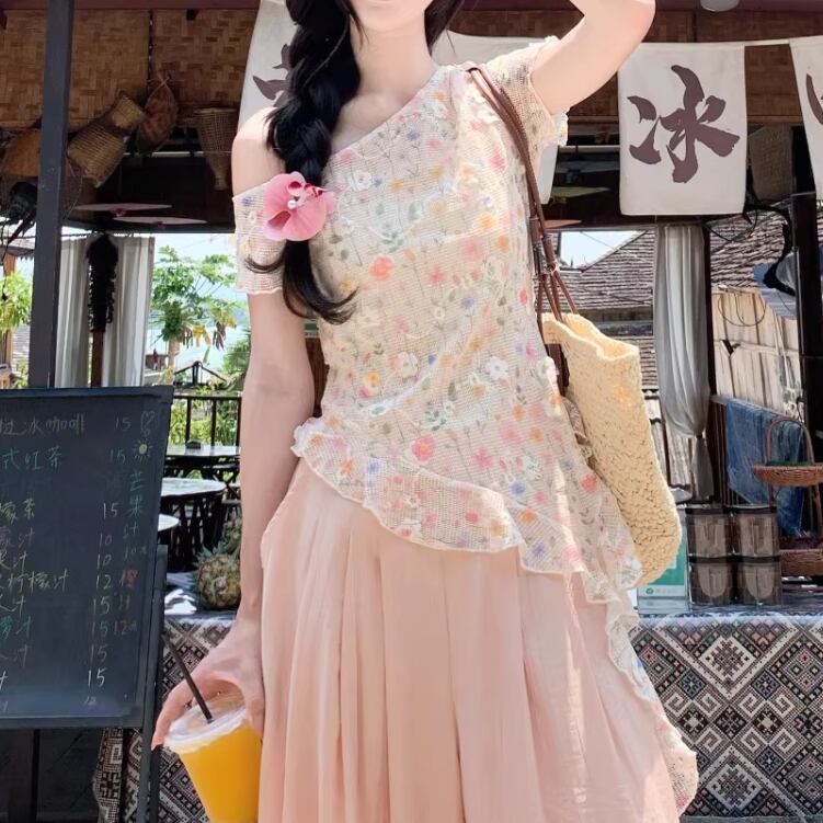 【2点セット】ウエストマークカシュクールブラウス+フラワーミニスカート ・75346