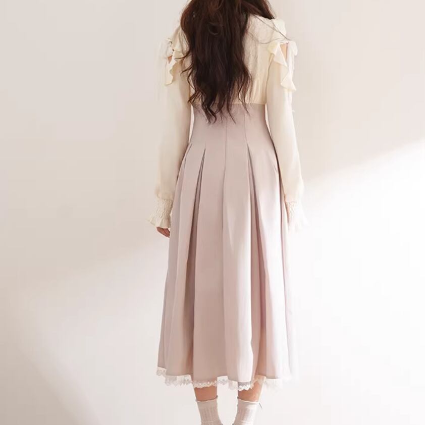 2色/チュールフラワーフリルネックボウタイワンピ ・54889