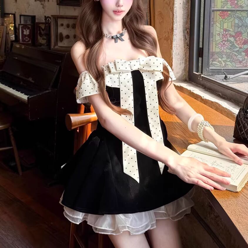 2色/チュールフラワーフリルネックボウタイワンピ ・54889