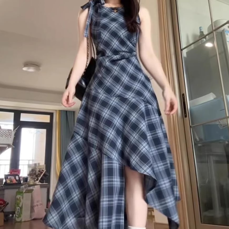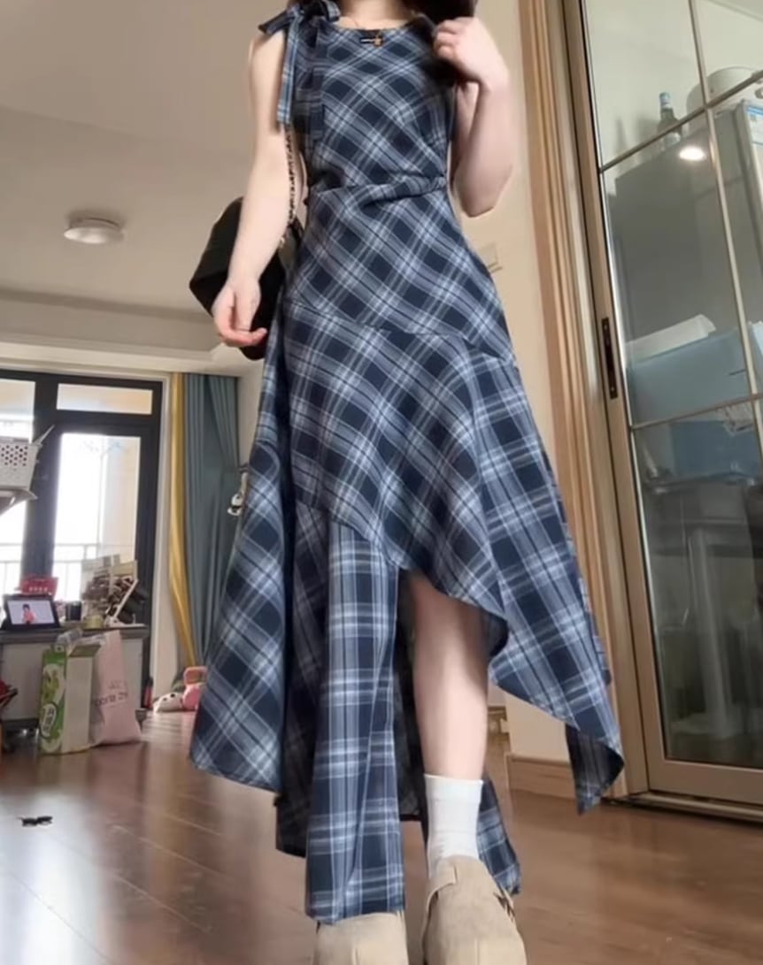 レースアップリボンのチェック柄ワンピ ・67351