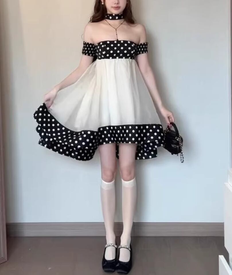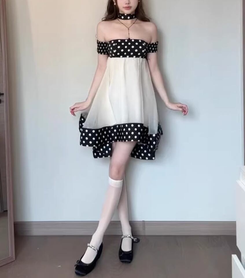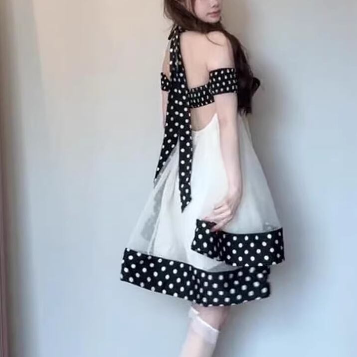 2色/チュールフラワーフリルネックボウタイワンピ ・54889