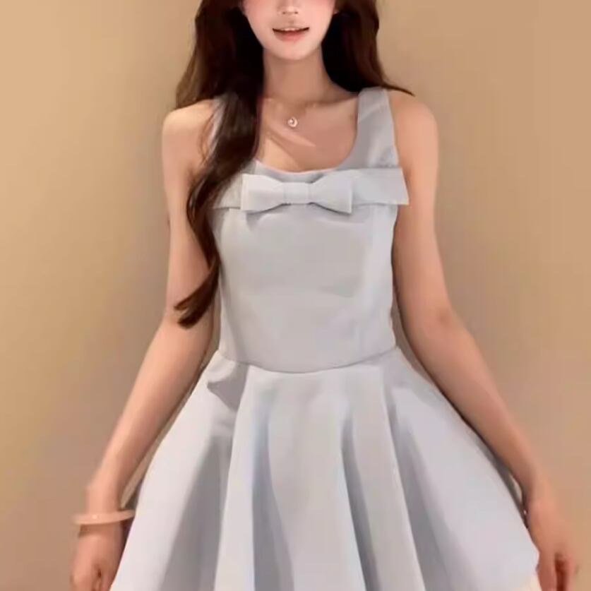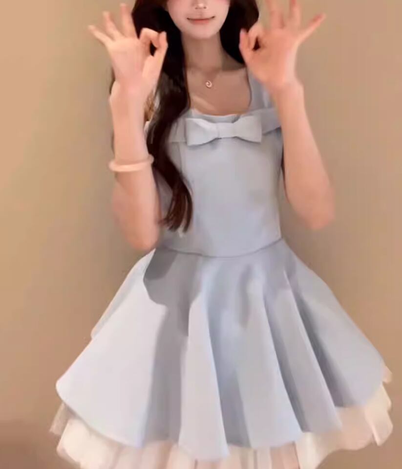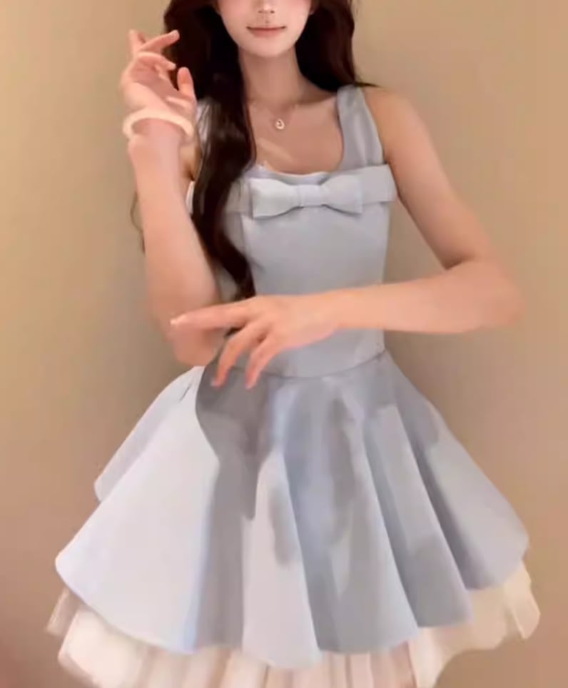 2色/チュールフラワーフリルネックボウタイワンピ ・54889