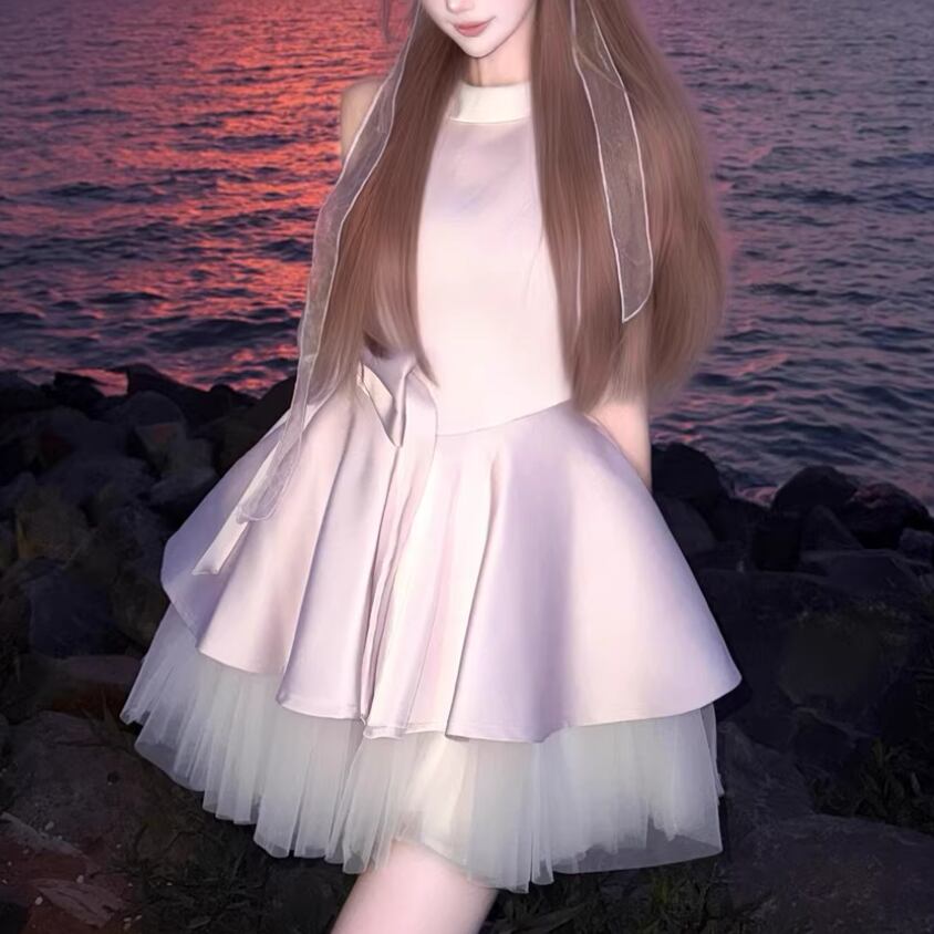 2色/チュールフラワーフリルネックボウタイワンピ ・54889