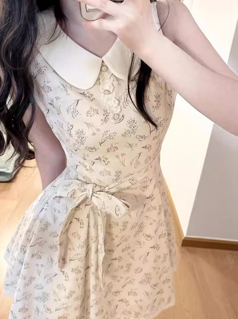 2色/チュールフラワーフリルネックボウタイワンピ ・54889