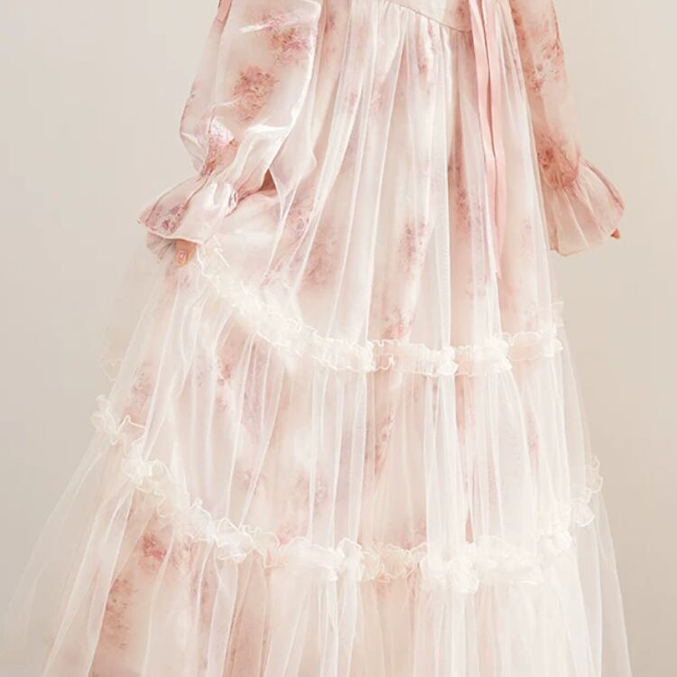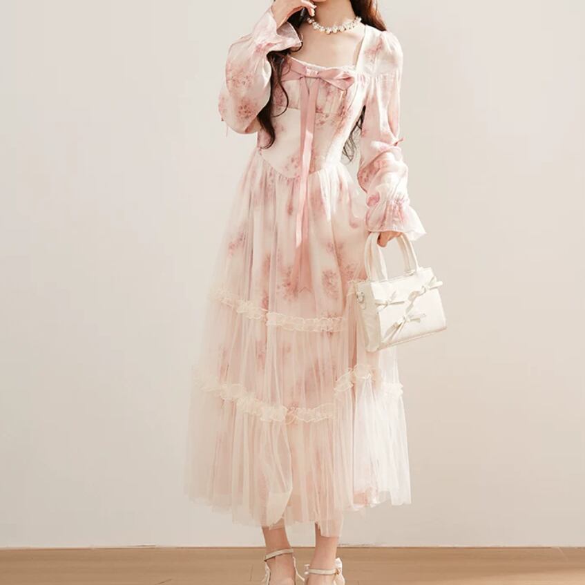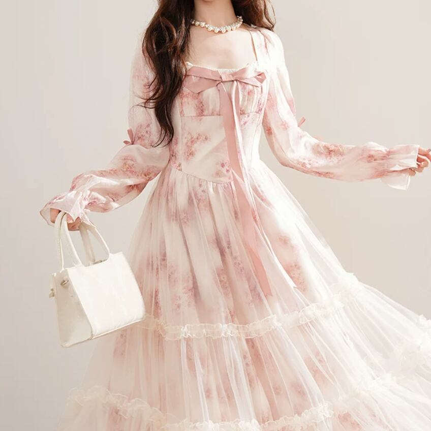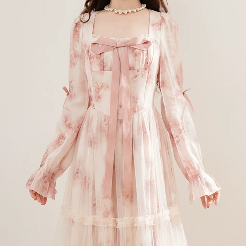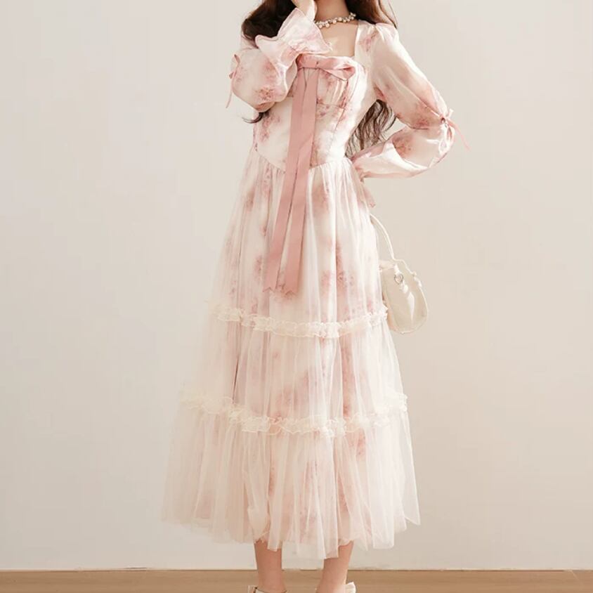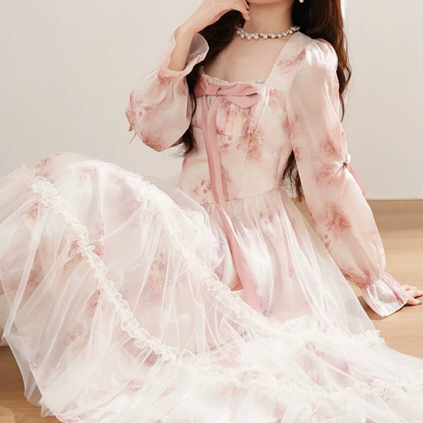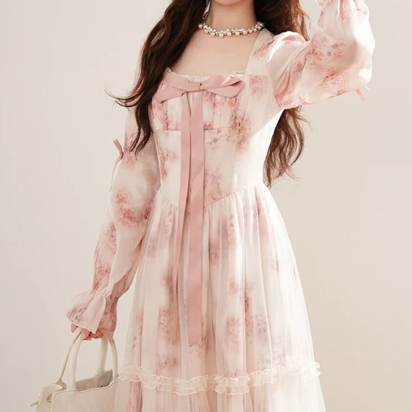 2色/チュールフラワーフリルネックボウタイワンピ ・54889