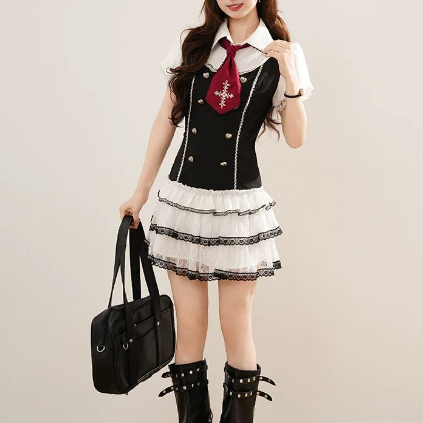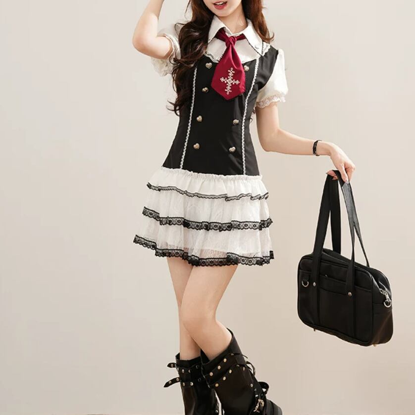 2色/チュールフラワーフリルネックボウタイワンピ ・54889
