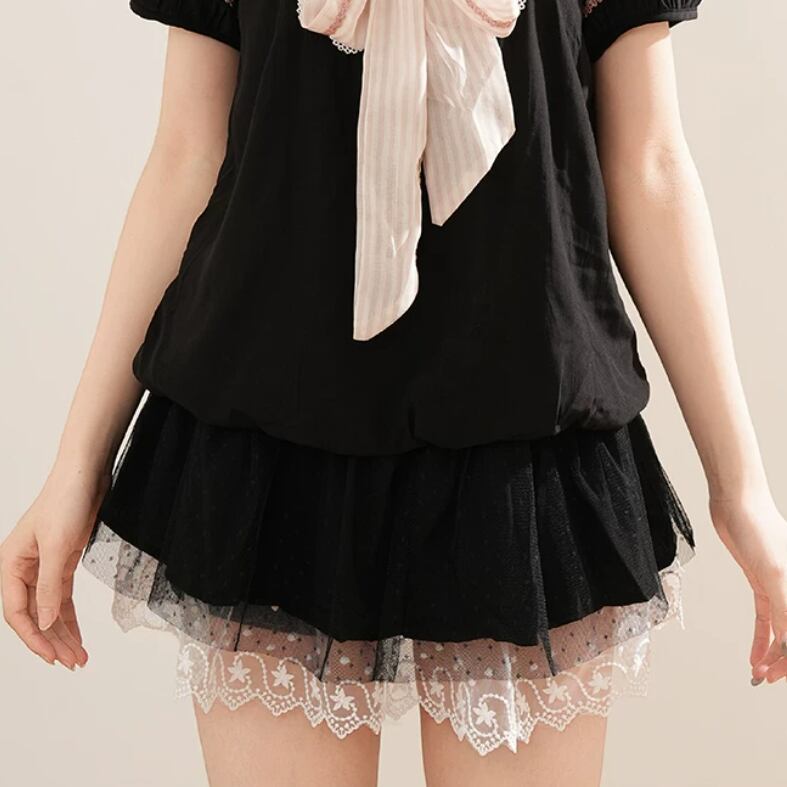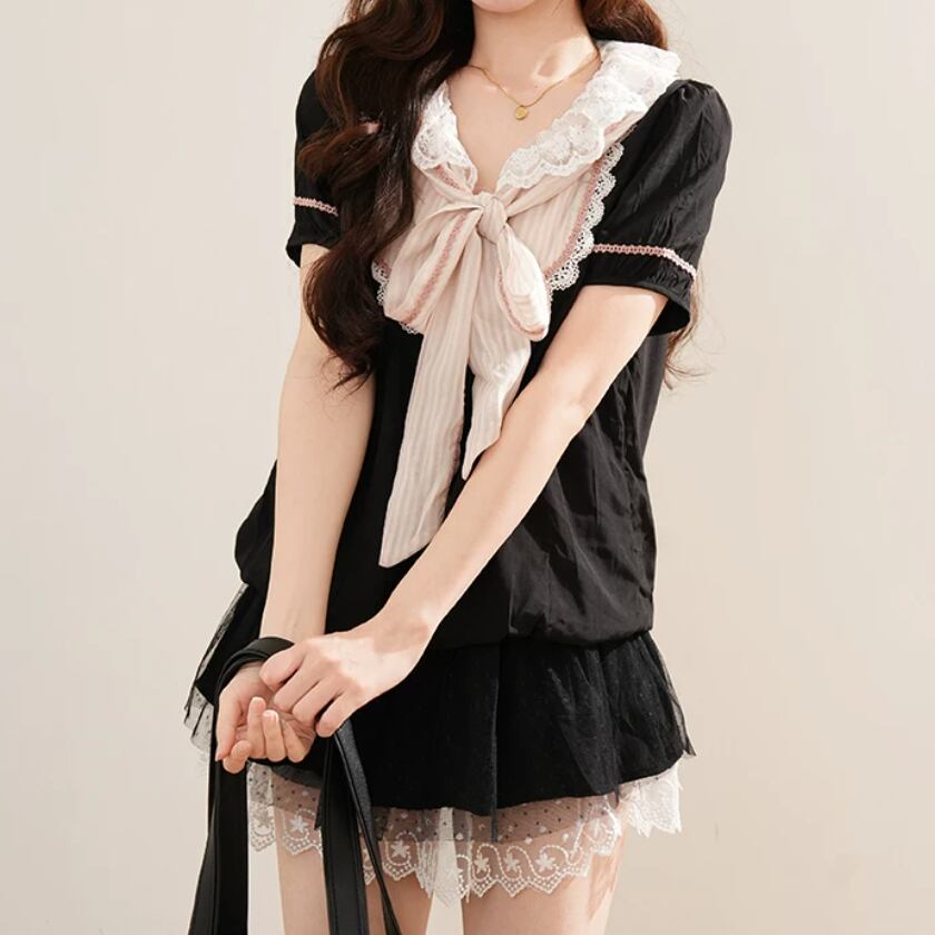 2色/チュールフラワーフリルネックボウタイワンピ ・54889