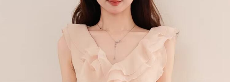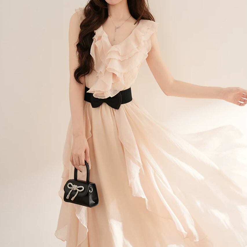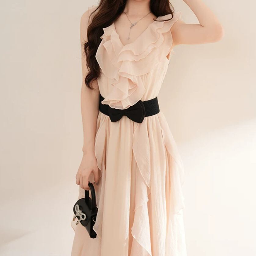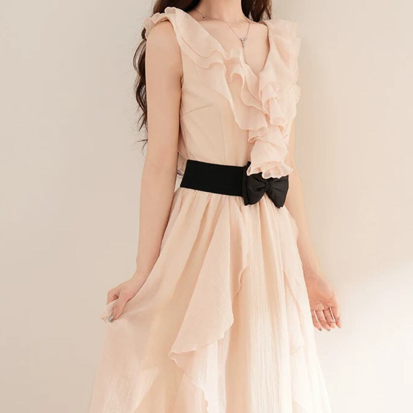 2色/チュールフラワーフリルネックボウタイワンピ ・54889
